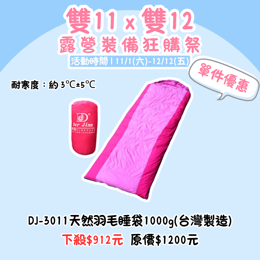 雙11X雙12,露營裝備狂購季 | DJ-3011天然羽毛保暖睡袋1000g(台灣製造)單品優惠價『活動時間:𝟭𝟭/𝟬𝟭-𝟭𝟮/𝟭𝟮』