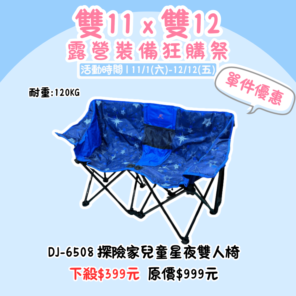 雙11X雙12,露營裝備狂購季 | DJ-6508 探險家兒童星夜雙人椅 單品優惠價『活動時間:𝟭𝟭/𝟬𝟭-𝟭𝟮/𝟭𝟮』