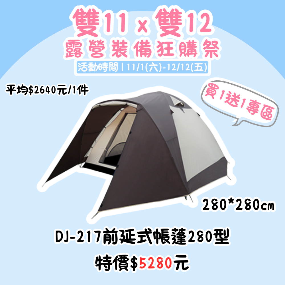 雙11X雙12,露營裝備狂購季 | DJ-217豪華6-8人前延式帳蓬(280型) 買一送一『售完』