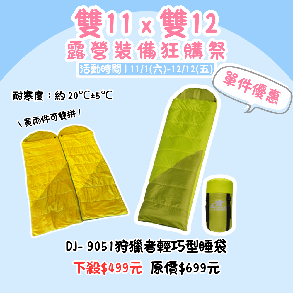 雙11X雙12,露營裝備狂購季 | DJ- 9051 狩獵者輕巧型睡袋(可雙拼) 單品優惠價『活動時間:𝟭𝟭/𝟬𝟭-𝟭𝟮/𝟭𝟮』