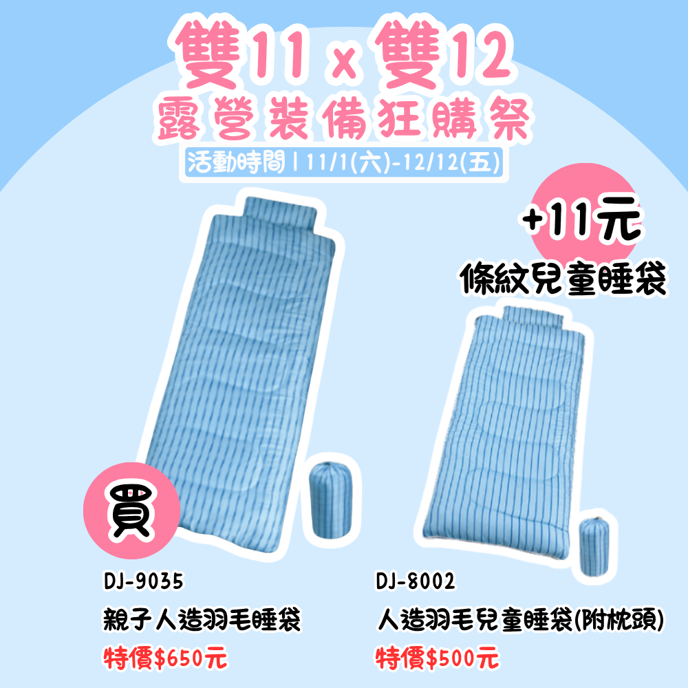 雙11X雙12,露營裝備狂購季 | DJ-9035親子人造羽毛睡袋(附枕頭) +購11元 條紋兒童睡袋 加購價優惠『活動時間:𝟭𝟭/𝟬𝟭-𝟭𝟮/𝟭𝟮』