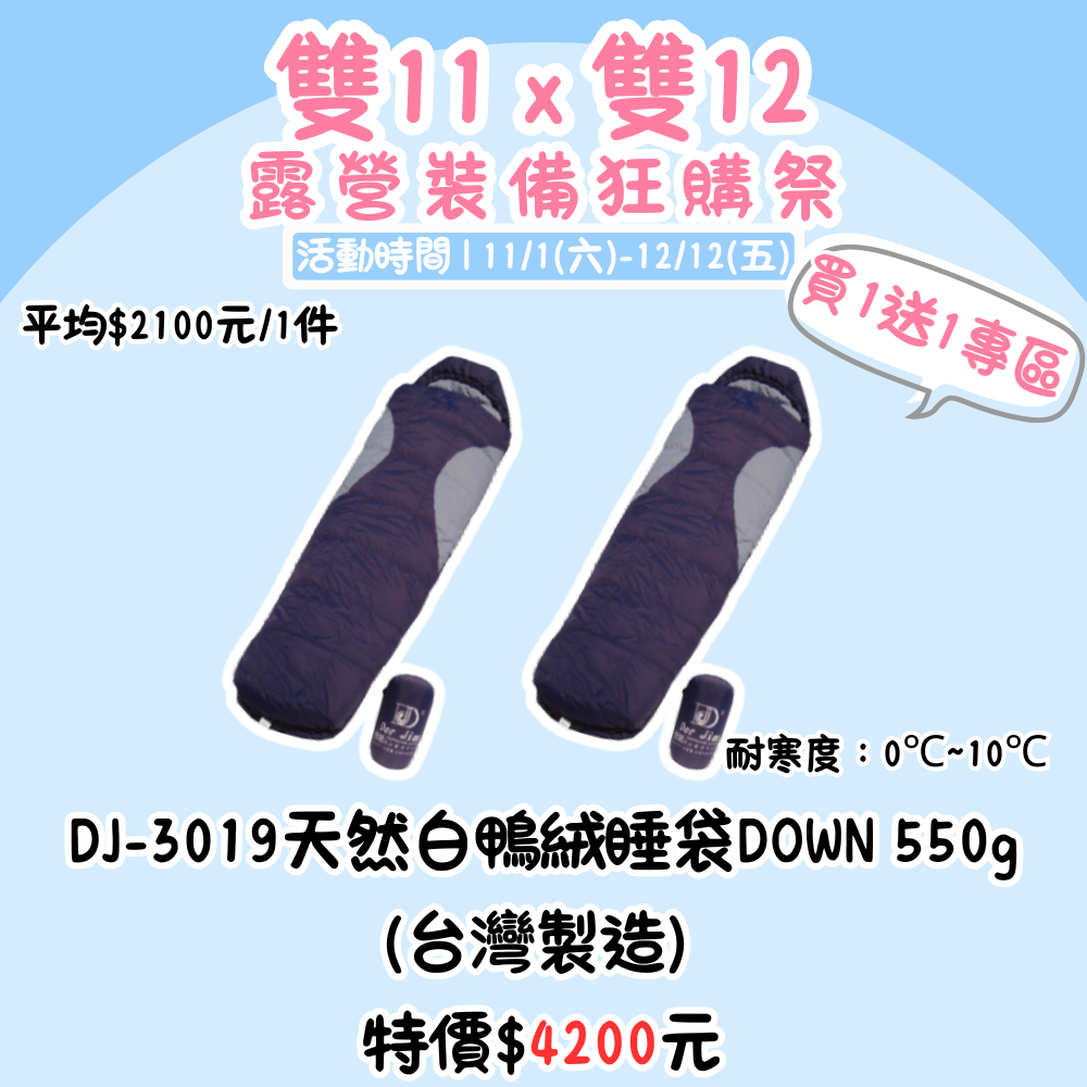 雙11X雙12,露營裝備狂購季 | DJ-3019天然白鴨絨睡袋DOWN 550g(台灣製造)買一送一 『活動時間:𝟭𝟭/𝟬𝟭-𝟭𝟮/𝟭𝟮』