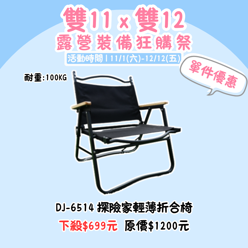 雙11X雙12,露營裝備狂購季 | DJ-6514 探險家輕薄折合椅 單品優惠價『活動時間:𝟭𝟭/𝟬𝟭-𝟭𝟮/𝟭𝟮』