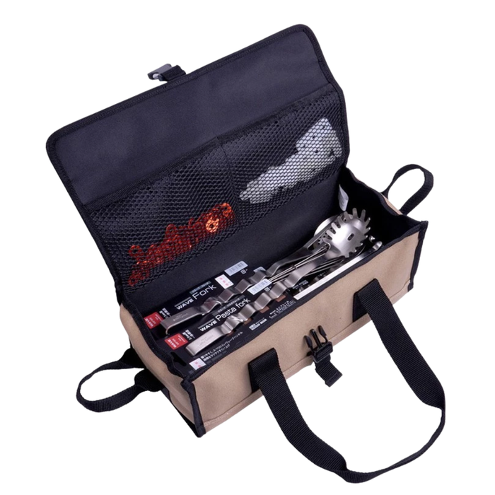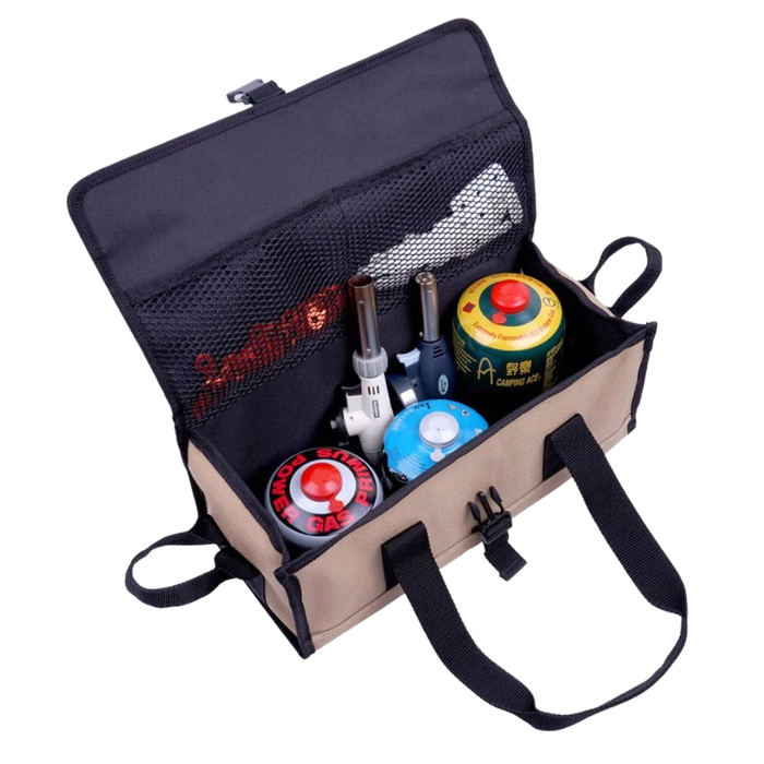 ◍ 萬用帆布工具袋可收納各式營釘、營槌、營繩、防雷帽、餐具、S掛勾、調節拉繩、調節片、燈勾、餐具廚具刀具、碗筷、料理剪刀、 瓦斯等用具。